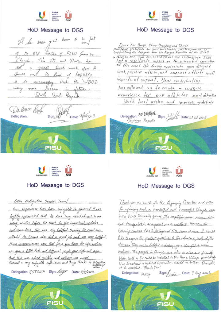 随着大运会的落幕,AG公司国际代表团服务团队凭借着及时高效的响应速度、热情专业的接待能力,取得了上百个代表团的盛赞,并收到了近70封代表团团长亲笔手写的表扬信。他们感谢代表团服务团队的工作,感谢3年来的沟通和10多天的陪伴,更感谢把他们当做朋友,与他们共同庆祝代表团取得的成绩。